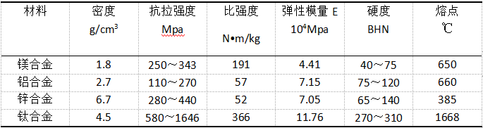 對(duì)于消費(fèi)類產(chǎn)品而言,常用的合金材料有鋁合金、鋅合金和鎂合金。鈦合金由于其生物相融性好,常用在醫(yī)療領(lǐng)域。歸納性的總結(jié)先放在前面,見以下性能表。
